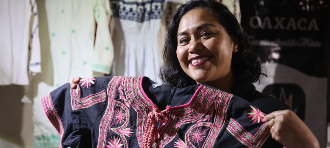 Comparte que algunas de las piezas cuentan la historia de su natal Oaxaca, “por ejemplo, este es el maguey del pulque, del mezcal agave. Tenemos también un bordado que simboliza los ríos que están en la comunidad y estos bordados son los cerros de las 20 divinidades, soles y flores de la sabiduría que se dan en la comunidad”.