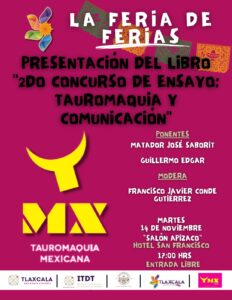 En esta misma sede el martes 14 de noviembre a las 17:00 horas se dará a conocer la obra del Segundo Concurso de Ensayo “Tauromaquia y comunicación”, que contará con la participación del matador José Saborit y Guillermo Edgar.