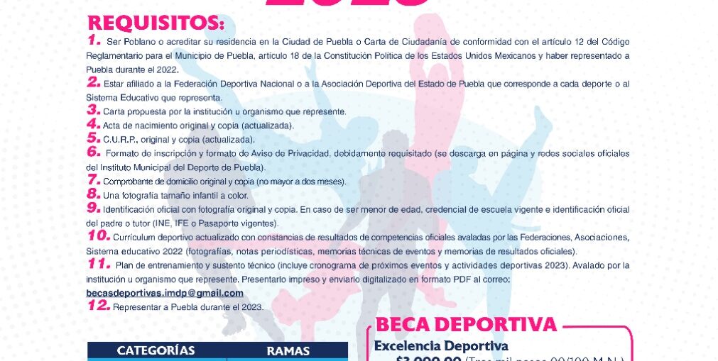 Para poder recibir este apoyo es importante mencionar que la o el interesado debe haber nacido, residir o representar al Municipio de Puebla en algún deporte convencional o adaptado varonil-femenil, para el caso de deporte conjunto, la beca se recibirá de manera individual. Es importante que su actividad y documentos sean comprobables y cumplan con los requisitos establecidos.