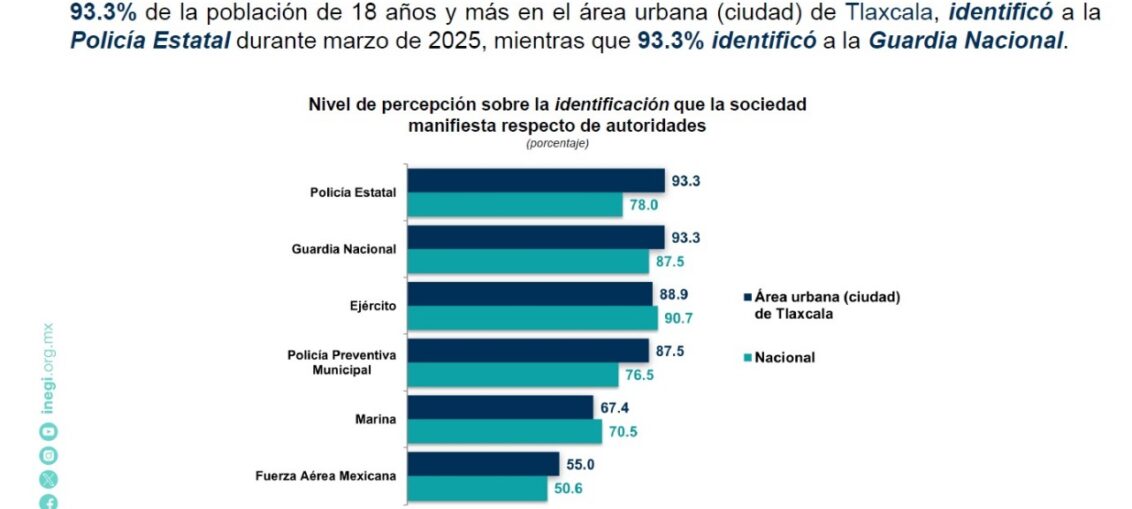 De acuerdo con los resultados de la Encuesta Nacional de Seguridad Pública Urbana (ENSU), correspondiente al primer trimestre de 2025, el 93.3% de la población de 18 años y más en la Ciudad de Tlaxcala, área urbana integrada por 25 municipios, identifica a la Policía Estatal, porcentaje equiparable al de la Guardia Nacional.
