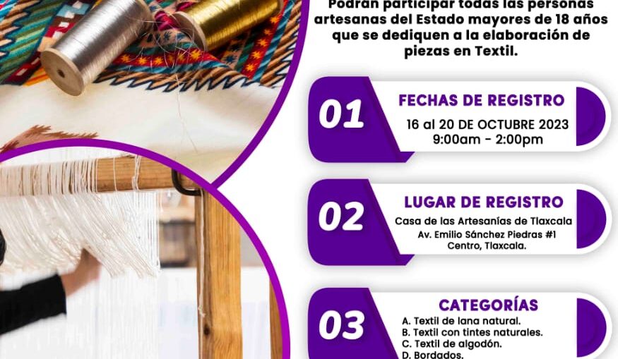 El gobierno del estado, a través de la Casa de las Artesanías de Tlaxcala (CAT), invita a los creadores de la entidad a participar en el XII Concurso Estatal de Textiles 2023, que tiene como objetivo reconocer su trabajo y talento, así como difundir la riqueza cultural del estado.