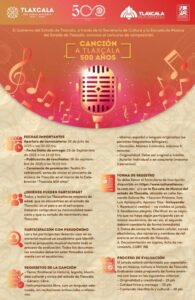 En el marco de la conmemoración por los 500 años de la fundación de la ciudad de Tlaxcala, el Gobierno del Estado, a través de la Secretaría de Cultura de Tlaxcala y la Escuela de Música del Estado (EMET), emitieron la Convocatoria Estatal de Composición Musical “Canción a Tlaxcala 500 años”, con el objetivo de rendir homenaje a la historia, identidad y legado cultural del pueblo tlaxcalteca a través de la música.