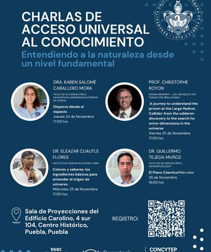 Las cuatro charlas dirigidas al público en general se realizan en el Salón de Proyecciones del Edificio Carolino, en 4 Sur 104, Colonia Centro. La entrada es gratuita. Los interesados sólo deben registrar su asistencia en http://www.fcfm.buap.mx/mrodriguez/charlaspublicas