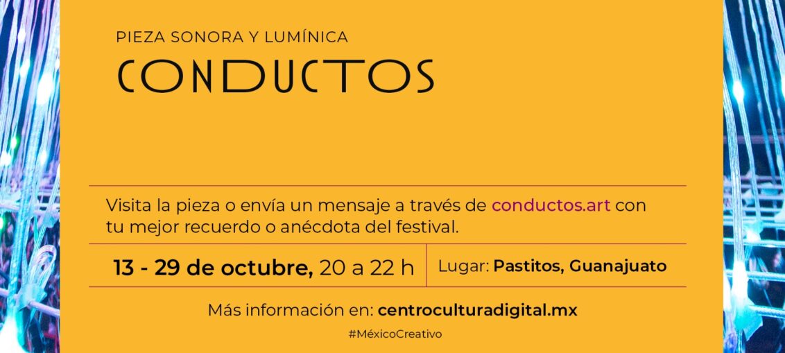 La Secretaría de Cultura del Gobierno de México, a través del Centro de Cultura Digital (CCD), presenta en la 50 edición del Festival Internacional Cervantino (FIC) la pieza interactiva Conductos, una intervención lumínica y sonora en la que las y los asistentes pueden grabar mensajes sonoros que se visualizarán en una pantalla monumental instalada en el parque Pastitos, de Guanajuato, del 13 al 29 de octubre del 2022.