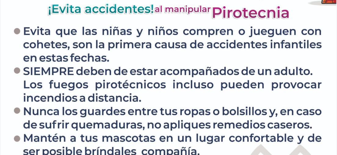 • Uso responsable de pirotecnia: La SSC recomienda no utilizar fuegos artificiales cerca de áreas habitadas o en condiciones de viento. De ser posible, asiste a eventos organizados por autoridades locales, que cuenten con medidas de seguridad.