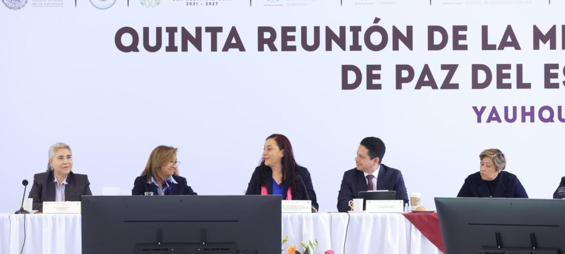 La gobernadora Lorena Cuéllar Cisneros encabezó este viernes la quinta reunión de la Mesa Interregional de Paz en Tlaxcala, en la que participó Martha Beatriz López López, representante de la Secretaría de Seguridad y Protección Ciudadana federal (SSPC), integrantes del gabinete de seguridad estatal y los 60 presidentes municipales.