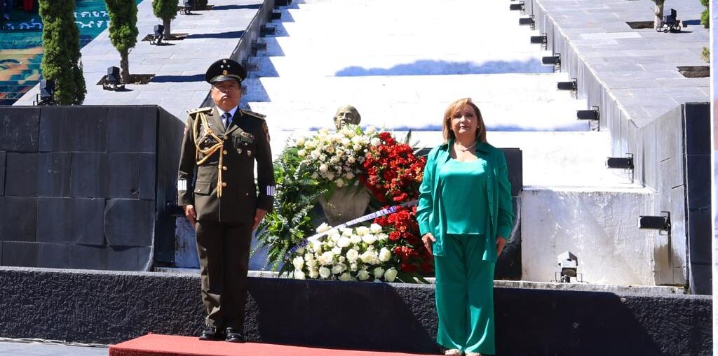Al rendir honores al lábaro patrio en las Escalinatas de los Héroes de la ciudad de Tlaxcala, la mandataria estatal y el comandante de la 23a Zona Militar, Andrés Ojeda Ramírez, montaron guardia de honor en el monumento a quienes defendieron la soberanía nacional.