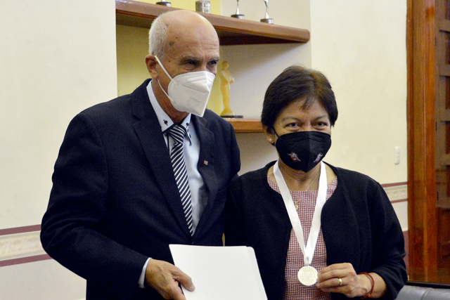 Como muestra de agradecimiento a más de tres décadas de colaboración académica, científica y cultural entre la BUAP y la Universidad de Camagüey “Ignacio Agramonte Loynaz”, el rector de esta institución cubana, Santiago Lajes Choy, entregó a su homóloga, la doctora María Lilia Cedillo Ramírez, la medalla conmemorativa de su 55 aniversario.