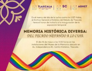 El Gobierno del Estado, a través del Archivo General e Histórico del Estado de Tlaxcala (AGHET) y en coordinación con la Secretaría de Cultura (SC) invita a la inauguración de la exposición temporal “Memoria histórica diversa: del pecado nefando a lo cuir”, a realizarse el próximo 16 de mayo, a las 11:00 horas, en el marco del Día Internacional contra la Homofobia, Transfobia y Bifobia, en el Museo de la Memoria.