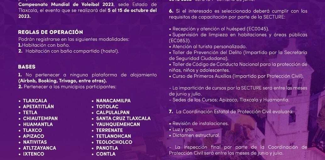 El gobierno del estado, a través de la Secretaría de Turismo (Secture), invita a la población a participar en la convocatoria del sello “Tlaxcala es tu Casa”, con la finalidad de tener una amplia oferta de alojamiento en la entidad durante el Mundial de Voleibol de Playa 2023 que se realizará del 5 al 15 de octubre en la entidad.