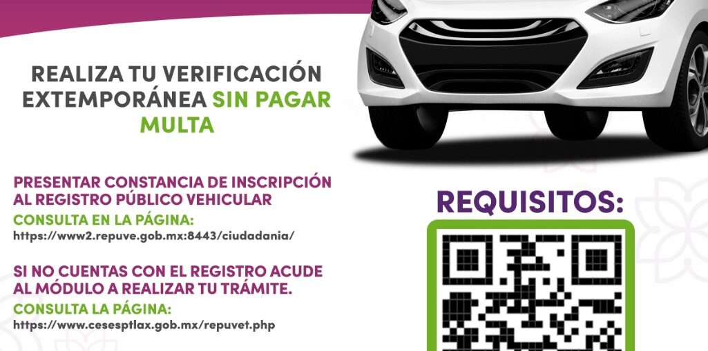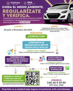 La Secretaría de Medio Ambiente (SMA) del Estado de Tlaxcala implementa la campaña “Cuida el Medio Ambiente, Regularízate y Verifica”, la cual tendrá estará vigente hasta diciembre de 2024.