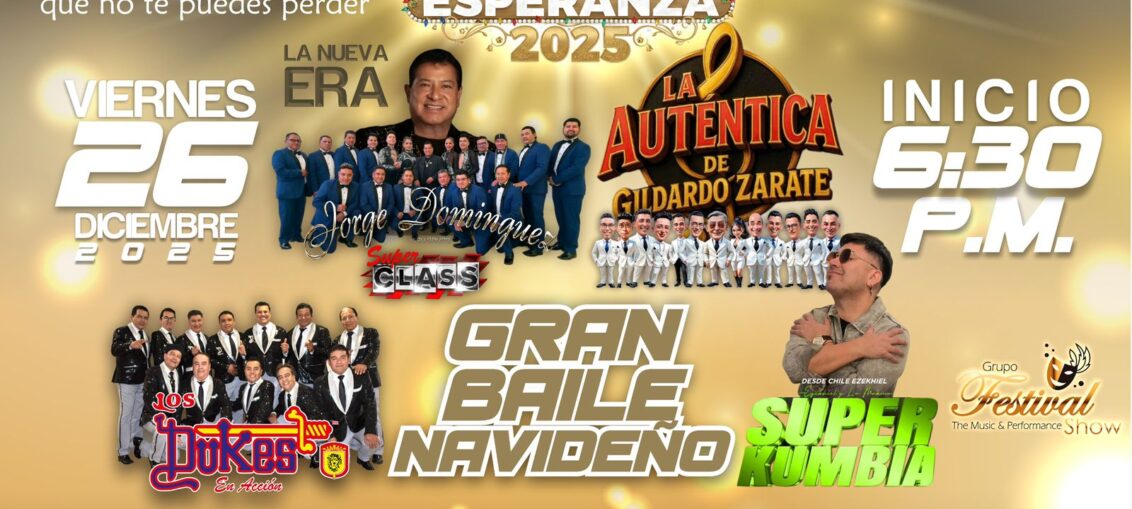 Este evento contará con una producción especial, destacando la presentación estelar de Jorge Domínguez, acompañado de grandes agrupaciones como La Auténtica de Gildardo Zárate, Los Dukes de Asís, Super Class, La Nueva Era y Super Kumbia, quienes encenderán el ambiente con un gran baile navideño pensado para todas las edades.
