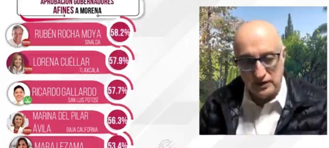 La casa encuestadora refiere que, el primer sitio lo ocupa el gobernador de Sinaloa, Rubén Rocha Moya, con el 58.2 por ciento; le sigue, Lorena Cuéllar, de Tlaxcala, con el 57.9 por ciento; en el tercer lugar, Ricardo Gallardo de San Luis Potosí con 57.7 por ciento; en el cuarto sitio, Marina del Pilar Ávila, de Baja California con el 56.3 por ciento; y en la quinta posición, Mara Lezama de Quintana Roo con el 53.4 por ciento.