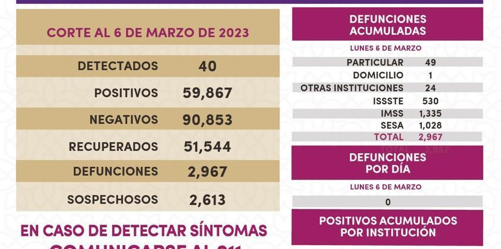 Los datos registrados en la plataforma nacional del Sistema de Vigilancia Epidemiológica de Enfermedades Respiratorias (Sisver), confirmaron 40 casos positivos de Covid-19 y cero defunciones, el 6 de marzo de 2023 en la entidad.