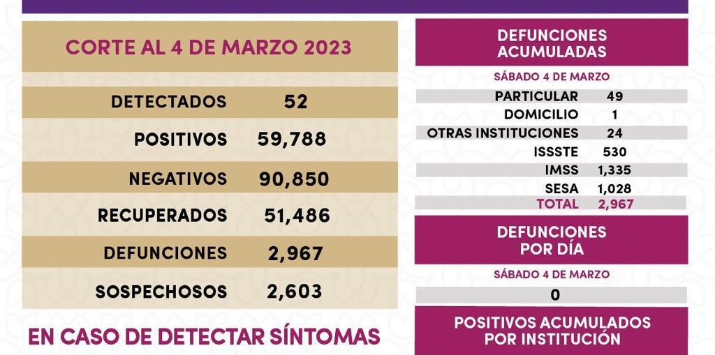 Los datos registrados en la plataforma nacional del Sistema de Vigilancia Epidemiológica de Enfermedades Respiratorias (Sisver), confirmaron 52 casos positivos de Covid-19 y cero defunciones, el 4 de marzo de 2023 en la entidad.