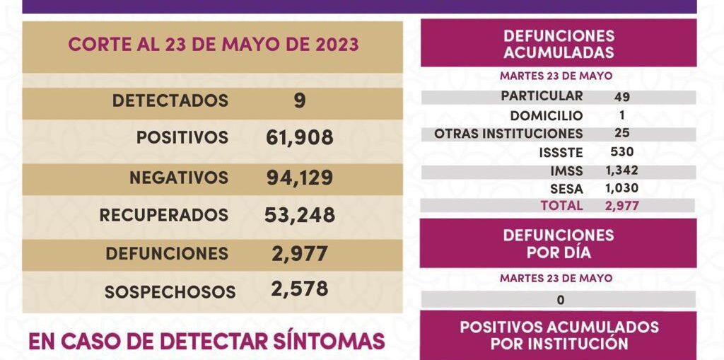 Los datos registrados en la plataforma nacional del Sistema de Vigilancia Epidemiológica de Enfermedades Respiratorias (Sisver), confirmaron 9 casos positivos de Covid-19 y cero defunciones, el 23 de mayo de 2023 en la entidad.
