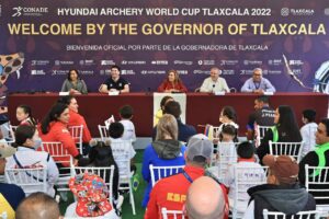 La gobernadora Lorena Cuéllar Cisneros dio la bienvenida oficial a las y los arqueros de la Final de Copa del Mundo de Tiro con Arco Tlaxcala 2022, que se efectuará el 15 y 16 de octubre en la ciudad capital, donde competirán los 32 mejores atletas del orbe en las modalidades de arco recurvo y compuesto.
