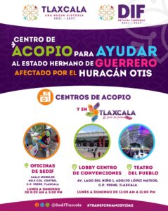 Cabe destacar que otro punto de acopio se encuentra habilitado en las oficinas del Sistema Estatal DIF, ubicadas en la calle José María Morelos, número 4, en la capital tlaxcalteca, en un horario de 8:00 a 17:00 horas.