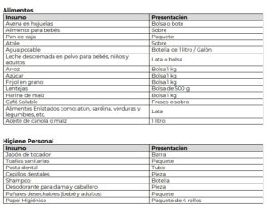 Pueden ser alimentos como avena en hojuelas, atole en sobre, agua embotellada, leche descremada en polvo, arroz, azúcar, frijol, lentejas; enlatados como atún, sardina, verduras y legumbres.
