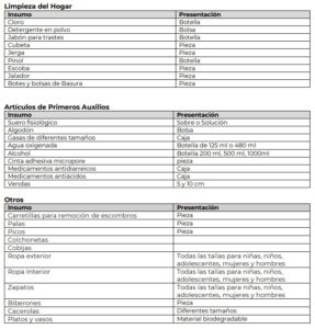 De igual forma cloro, detergente, jabón para trastes, escobas, cubetas y jergas, pinol, bolsas de basura; así como suero fisiológico, algodón, vendas, gasas de diferentes tamaños, agua oxigenada, alcohol, cinta adhesiva micropore, medicamentos antidiarreicos y antiácidos.
