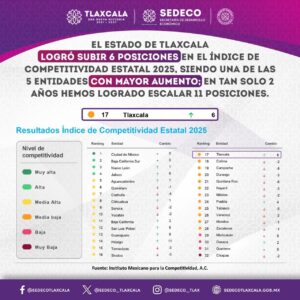 Tlaxcala fue uno de los 11 estados del país que subió posiciones en el Índice de Competitividad Estatal (ICE) 2025, publicado por el Instituto Mexicano para la Competitividad (IMCO), debido a que mejoró su desempeño en los indicadores que miden la capacidad estructural para generar, atraer y retener talento e inversión.