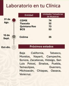 Con esta incorporación, Tlaxcala dispondrá de 32 unidades tomadoras de muestra, que se suman a las más de 250 unidades instaladas en conjunto en estados como la Ciudad de México, Quintana Roo, Baja California Sur y Colima, que también se incorporan al programa este mes de agosto, así como a los 60 laboratorios centrales que operarán de forma coordinada en toda la República.