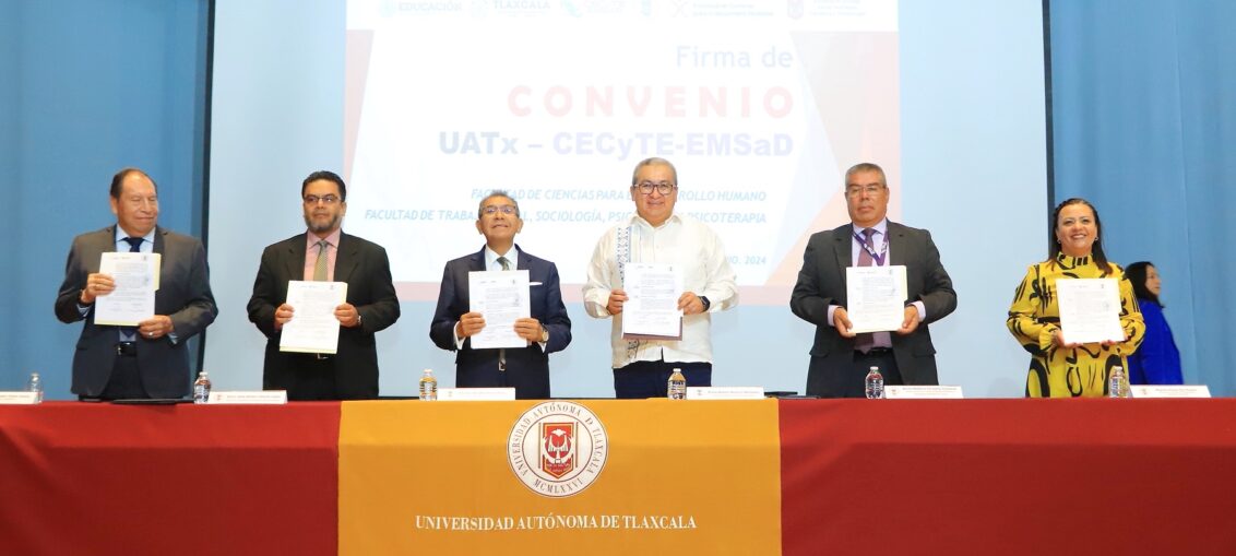 Con el fin de establecer una vinculación relativa a capacitación, así como de asesoría para docentes, estudiantes y padres de familia sobre temas de inclusión, violencia y conductas disruptivas en jóvenes, el Doctor Serafín Ortiz Ortiz, Rector de la Universidad Autónoma de Tlaxcala (UATx), y el Doctor Homero Meneses Hernández, Secretario de Educación Pública del Estado, signaron un convenio marco general de colaboración académica en las instalaciones del Teatro Universitario.