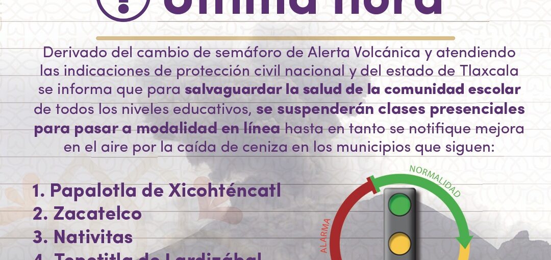 Protección Civil informa que se suspenden clases presenciales y se tomaran de manera virtual, debido a la actividad del volcán Popocatépetl y la caída de ceniza.