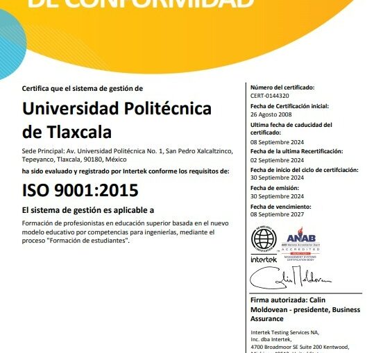 En un paso significativo hacia la excelencia académica y administrativa, la Universidad Politécnica de Tlaxcala (UPTx) ha obtenido la certificación bajo la norma internacional ISO 9001:2015, reafirmando su compromiso con la calidad y la mejora continua en todos sus procesos institucionales.